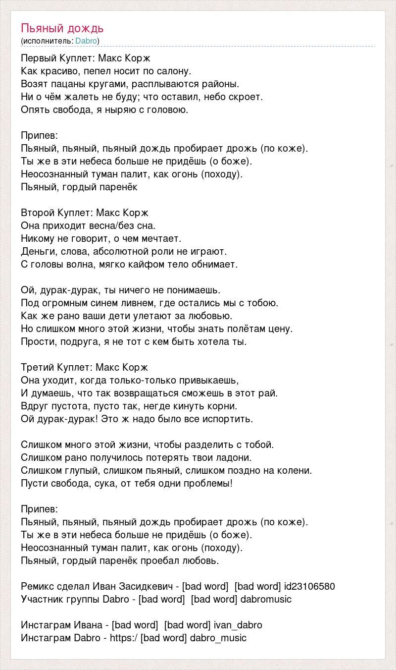 Первый Куплет: Макс Корж Как красиво, пепел носит по салону. Возят пацаны кругами, расплываются районы. Ни о чём жалеть не буду; что оставил, небо скроет. Опять свобода, я ныряю с головою. Припев: Пьяный, пьяный, пьяный дождь пробирает дрожь (по коже). Ты же в эти небеса больше не придёшь (о боже). Неосознанный туман палит, как огонь (походу). Пьяный, гордый паренёк Второй Куплет: Макс Корж Она приходит весна/без сна. Никому не говорит, о чем мечтает. Деньги, слова, абсолютной роли не играют. С головы волна, мягко кайфом тело обнимает. Ой, дурак-дурак, ты ничего не понимаешь. Под огромным синем ливнем, где остались мы с тобою. Как же рано ваши дети улетают за любовью. Но слишком много этой жизни, чтобы знать полётам цену. Прости, подруга, я не тот с кем быть хотела ты. Третий Куплет: Макс Корж Она уходит, когда только-только привыкаешь, И думаешь, что так возвращаться сможешь в этот рай. Вдруг пустота, пусто так, негде кинуть корни. Ой дурак-дурак! Это ж надо было все испортить. Слишком много этой жизни, чтобы разделить с тобой. Слишком рано получилось потерять твои ладони. Слишком глупый, слишком пьяный, слишком поздно на колени. Пусти свобода, сука, от тебя одни проблемы! Припев: Пьяный, пьяный, пьяный дождь пробирает дрожь (по коже). Ты же в эти небеса больше не придёшь (о боже). Неосознанный туман палит, как огонь (походу). Пьяный, гордый паренёк проебал любовь. Ремикс сделал Иван Засидкевич - [bad word] [bad word] id23106580 Участник группы Dabro - [bad word] [bad word] dabromusic Инстаграм Ивана - [bad word] [bad word] ivan_dabro Инстаграм Dabro - https:/ [bad word] dabro_music