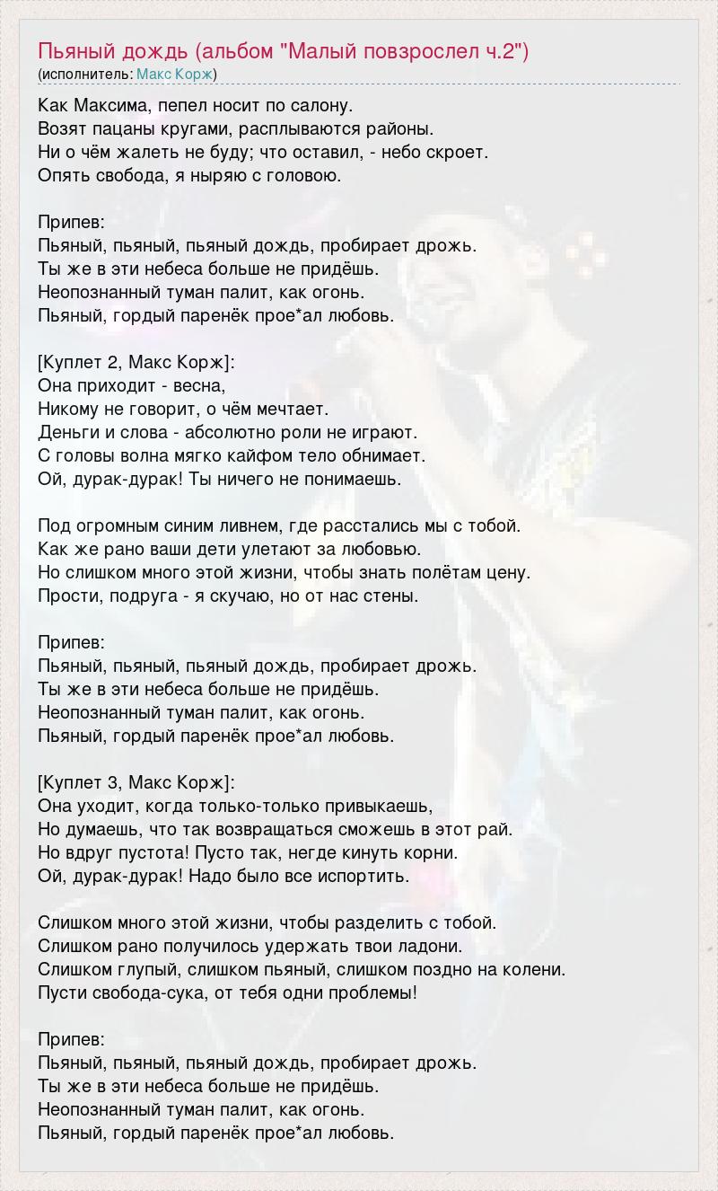 Как Максима, пепел носит по салону. Возят пацаны кругами, расплываются районы. Ни о чём жалеть не буду; что оставил, - небо скроет. Опять свобода, я ныряю с головою. Припев: Пьяный, пьяный, пьяный дождь, пробирает дрожь. Ты же в эти небеса больше не придёшь. Неопознанный туман палит, как огонь. Пьяный, гордый паренёк прое*ал любовь. [Куплет 2, Макс Корж]: Она приходит - весна, Никому не говорит, о чём мечтает. Деньги и слова - абсолютно роли не играют. С головы волна мягко кайфом тело обнимает. Ой, дурак-дурак! Ты ничего не понимаешь. Под огромным синим ливнем, где расстались мы с тобой. Как же рано ваши дети улетают за любовью. Но слишком много этой жизни, чтобы знать полётам цену. Прости, подруга - я скучаю, но от нас стены. Припев: Пьяный, пьяный, пьяный дождь, пробирает дрожь. Ты же в эти небеса больше не придёшь. Неопознанный туман палит, как огонь. Пьяный, гордый паренёк прое*ал любовь. [Куплет 3, Макс Корж]: Она уходит, когда только-только привыкаешь, Но думаешь, что так возвращаться сможешь в этот рай. Но вдруг пустота! Пусто так, негде кинуть корни. Ой, дурак-дурак! Надо было все испортить. Слишком много этой жизни, чтобы разделить с тобой. Слишком рано получилось удержать твои ладони. Слишком глупый, слишком пьяный, слишком поздно на колени. Пусти свобода-сука, от тебя одни проблемы! Припев: Пьяный, пьяный, пьяный дождь, пробирает дрожь. Ты же в эти небеса больше не придёшь. Неопознанный туман палит, как огонь. Пьяный, гордый паренёк прое*ал любовь.