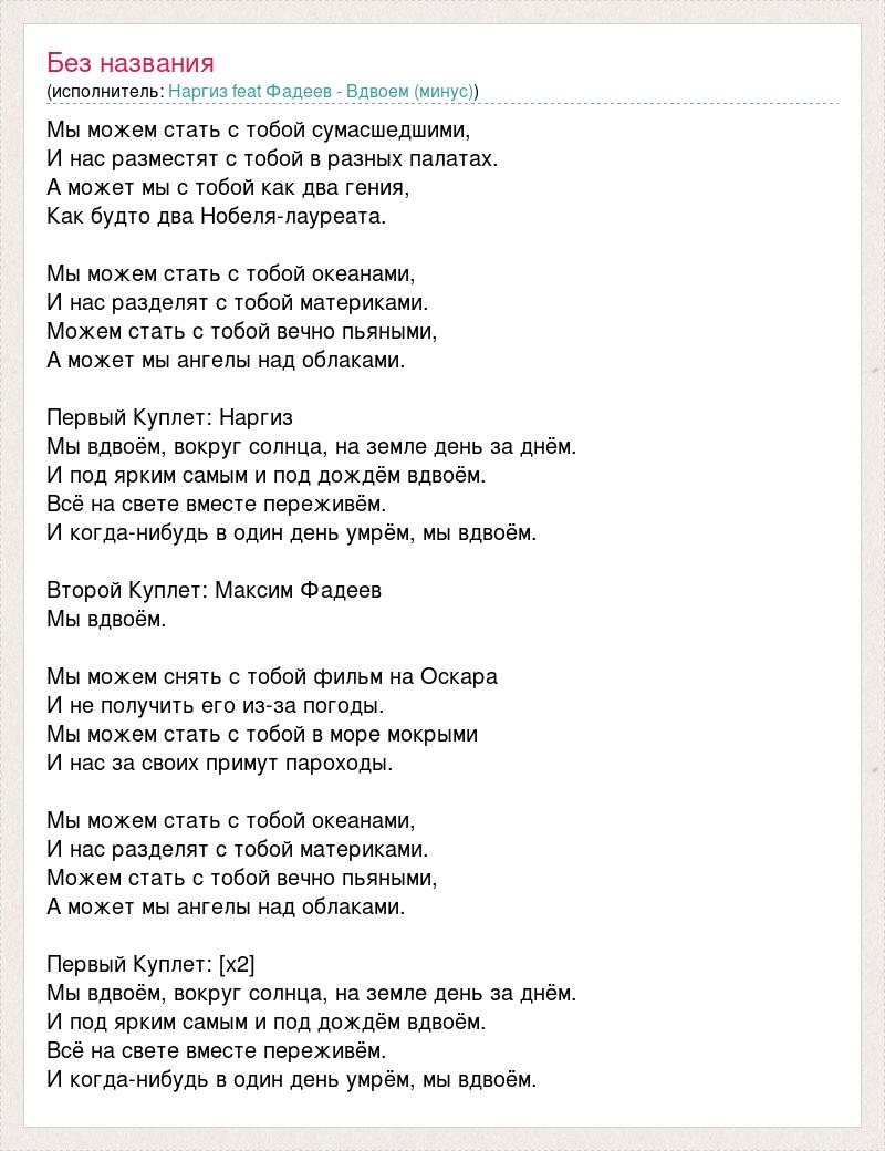 Мы можем стать с тобой сумасшедшими, И нас разместят с тобой в разных палатах. А может мы с тобой как два гения, Как будто два Нобеля-лауреата. Мы можем стать с тобой океанами, И нас разделят с тобой материками. Можем стать с тобой вечно пьяными, А может мы ангелы над облаками. Первый Куплет: Наргиз Мы вдвоём, вокруг солнца, на земле день за днём. И под ярким самым и под дождём вдвоём. Всё на свете вместе переживём. И когда-нибудь в один день умрём, мы вдвоём. Второй Куплет: Максим Фадеев Мы вдвоём. Мы можем снять с тобой фильм на Оскара И не получить его из-за погоды. Мы можем стать с тобой в море мокрыми И нас за своих примут пароходы. Мы можем стать с тобой океанами, И нас разделят с тобой материками. Можем стать с тобой вечно пьяными, А может мы ангелы над облаками. Первый Куплет: [х2] Мы вдвоём, вокруг солнца, на земле день за днём. И под ярким самым и под дождём вдвоём. Всё на свете вместе переживём. И когда-нибудь в один день умрём, мы вдвоём.