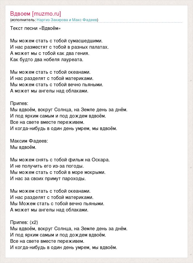 Текст песни «Вдвоём» Мы можем стать с тобой сумасшедшими. И нас разместят с тобой в разных палатах. А может мы с тобой как два гения. Как будто два нобеля лауреата. Мы можем стать с тобой океанами. И нас разделят с тобой материками. Мы можем стать с тобой вечно пьяными. А может мы ангелы над облаками. Припев: Мы вдвоём, вокруг Солнца, на Земле день за днём. И под ярким самым и под дождем вдвоём. Все на свете вместе переживем. И когда-нибудь в один день умрем, мы вдвоём. Максим Фадеев: Мы вдвоём. Мы можем снять с тобой фильм на Оскара. И не получить его из-за погоды. Мы можем стать с тобой в море мокрыми. И нас за своих примут пароходы. Мы можем стать с тобой океанами. И нас разделят с тобой материками. Мы Можем стать с тобой вечно пьяными. А может мы ангелы над облаками. Припев: (х2) Мы вдвоём, вокруг Солнца, на Земле день за днём. И под ярким самым и под дождем вдвоём. Все на свете вместе переживем. И когда-нибудь в один день умрем, мы вдвоём.