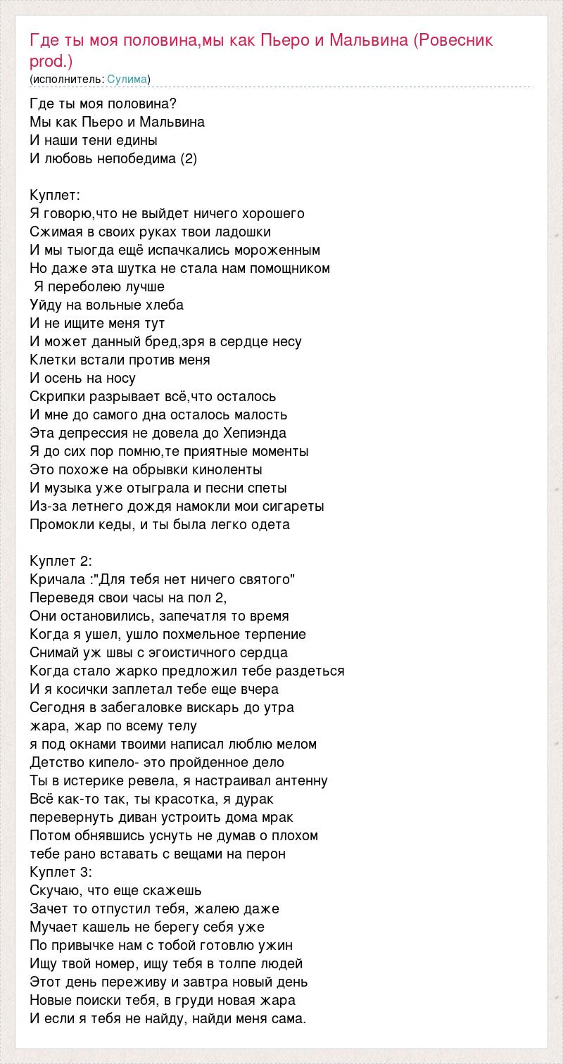 Где ты моя половина? Мы как Пьеро и Мальвина И наши тени едины И любовь непобедима (2) Куплет: Я говорю,что не выйдет ничего хорошего Сжимая в своих руках твои ладошки И мы тыогда ещё испачкались мороженным Но даже эта шутка не стала нам помощником Я переболею лучше Уйду на вольные хлеба И не ищите меня тут И может данный бред,зря в сердце несу Клетки встали против меня И осень на носу Скрипки разрывает всё,что осталось И мне до самого дна осталось малость Эта депрессия не довела до Хепиэнда Я до сих пор помню,те приятные моменты Это похоже на обрывки киноленты И музыка уже отыграла и песни спеты Из-за летнего дождя намокли мои сигареты Промокли кеды, и ты была легко одета Куплет 2: Кричала :"Для тебя нет ничего святого" Переведя свои часы на пол 2, Они остановились, запечатля то время Когда я ушел, ушло похмельное терпение Снимай уж швы с эгоистичного сердца Когда стало жарко предложил тебе раздеться И я косички заплетал тебе еще вчера Сегодня в забегаловке вискарь до утра жара, жар по всему телу я под окнами твоими написал люблю мелом Детство кипело- это пройденное дело Ты в истерике ревела, я настраивал антенну Всё как-то так, ты красотка, я дурак перевернуть диван устроить дома мрак Потом обнявшись уснуть не думав о плохом тебе рано вставать с вещами на перон Куплет 3: Скучаю, что еще скажешь Зачет то отпустил тебя, жалею даже Мучает кашель не берегу себя уже По привычке нам с тобой готовлю ужин Ищу твой номер, ищу тебя в толпе людей Этот день переживу и завтра новый день Новые поиски тебя, в груди новая жара И если я тебя не найду, найди меня сама.