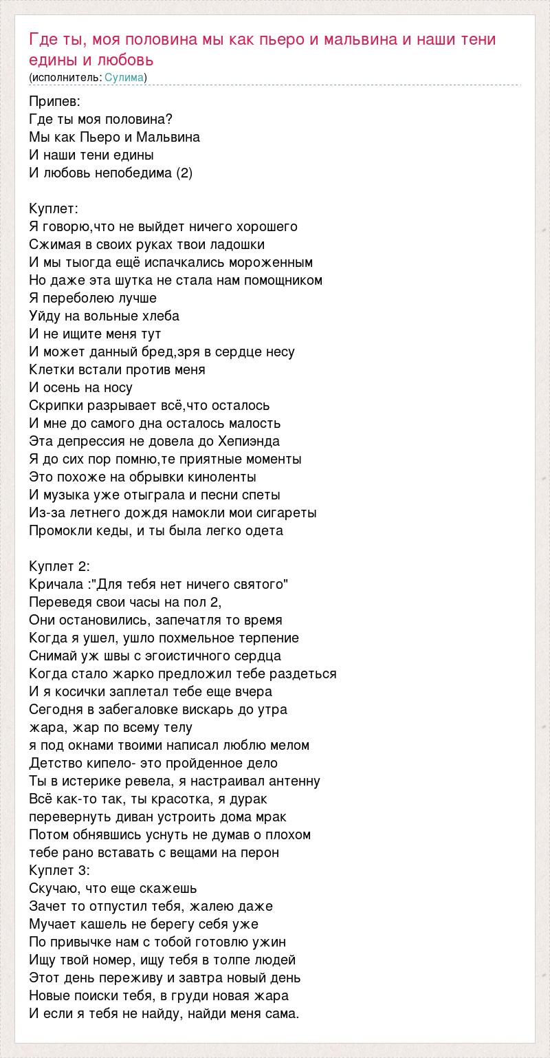 Припев: Где ты моя половина? Мы как Пьеро и Мальвина И наши тени едины И любовь непобедима (2) Куплет: Я говорю,что не выйдет ничего хорошего Сжимая в своих руках твои ладошки И мы тыогда ещё испачкались мороженным Но даже эта шутка не стала нам помощником Я переболею лучше Уйду на вольные хлеба И не ищите меня тут И может данный бред,зря в сердце несу Клетки встали против меня И осень на носу Скрипки разрывает всё,что осталось И мне до самого дна осталось малость Эта депрессия не довела до Хепиэнда Я до сих пор помню,те приятные моменты Это похоже на обрывки киноленты И музыка уже отыграла и песни спеты Из-за летнего дождя намокли мои сигареты Промокли кеды, и ты была легко одета Куплет 2: Кричала :"Для тебя нет ничего святого" Переведя свои часы на пол 2, Они остановились, запечатля то время Когда я ушел, ушло похмельное терпение Снимай уж швы с эгоистичного сердца Когда стало жарко предложил тебе раздеться И я косички заплетал тебе еще вчера Сегодня в забегаловке вискарь до утра жара, жар по всему телу я под окнами твоими написал люблю мелом Детство кипело- это пройденное дело Ты в истерике ревела, я настраивал антенну Всё как-то так, ты красотка, я дурак перевернуть диван устроить дома мрак Потом обнявшись уснуть не думав о плохом тебе рано вставать с вещами на перон Куплет 3: Скучаю, что еще скажешь Зачет то отпустил тебя, жалею даже Мучает кашель не берегу себя уже По привычке нам с тобой готовлю ужин Ищу твой номер, ищу тебя в толпе людей Этот день переживу и завтра новый день Новые поиски тебя, в груди новая жара И если я тебя не найду, найди меня сама.