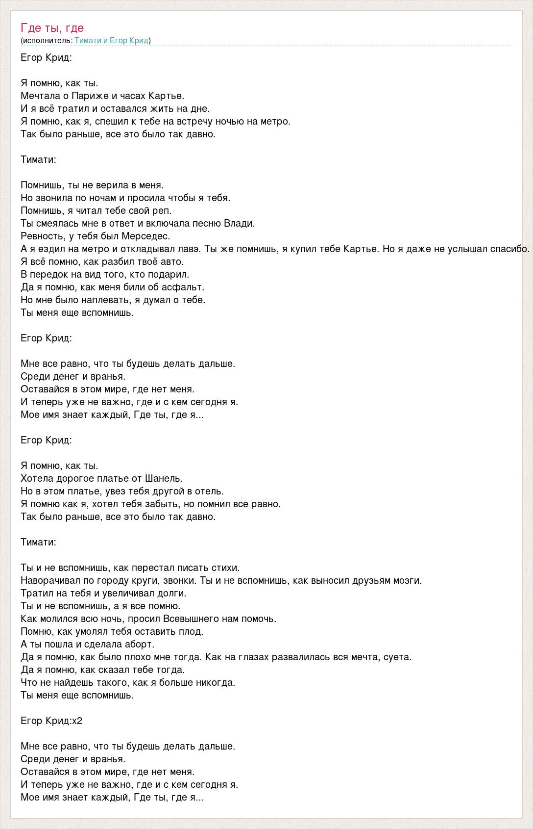 Егор Крид: Я помню, как ты. Мечтала о Париже и часах Картье. И я всё тратил и оставался жить на дне. Я помню, как я, спешил к тебе на встречу ночью на метро. Так было раньше, все это было так давно. Тимати: Помнишь, ты не верила в меня. Но звонила по ночам и просила чтобы я тебя. Помнишь, я читал тебе свой реп. Ты смеялась мне в ответ и включала песню Влади. Ревность, у тебя был Мерседес. А я ездил на метро и откладывал лавэ. Ты же помнишь, я купил тебе Картье. Но я даже не услышал спасибо. Я всё помню, как разбил твоё авто. В передок на вид того, кто подарил. Да я помню, как меня били об асфальт. Но мне было наплевать, я думал о тебе. Ты меня еще вспомнишь. Егор Крид: Мне все равно, что ты будешь делать дальше. Среди денег и вранья. Оставайся в этом мире, где нет меня. И теперь уже не важно, где и с кем сегодня я. Мое имя знает каждый, Где ты, где я... Егор Крид: Я помню, как ты. Хотела дорогое платье от Шанель. Но в этом платье, увез тебя другой в отель. Я помню как я, хотел тебя забыть, но помнил все равно. Так было раньше, все это было так давно. Тимати: Ты и не вспомнишь, как перестал писать стихи. Наворачивал по городу круги, звонки. Ты и не вспомнишь, как выносил друзьям мозги. Тратил на тебя и увеличивал долги. Ты и не вспомнишь, а я все помню. Как молился всю ночь, просил Всевышнего нам помочь. Помню, как умолял тебя оставить плод. А ты пошла и сделала аборт. Да я помню, как было плохо мне тогда. Как на глазах развалилась вся мечта, суета. Да я помню, как сказал тебе тогда. Что не найдешь такого, как я больше никогда. Ты меня еще вспомнишь. Егор Крид:х2 Мне все равно, что ты будешь делать дальше. Среди денег и вранья. Оставайся в этом мире, где нет меня. И теперь уже не важно, где и с кем сегодня я. Мое имя знает каждый, Где ты, где я...