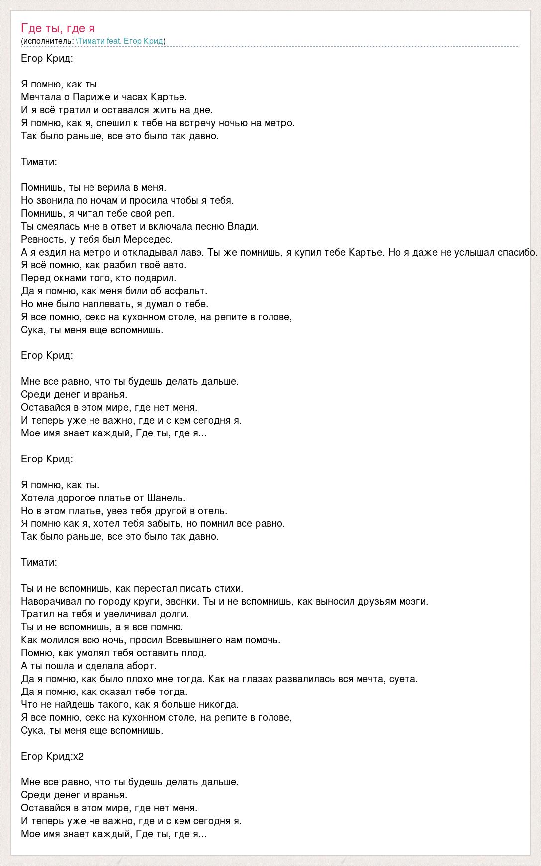 Егор Крид: Я помню, как ты. Мечтала о Париже и часах Картье. И я всё тратил и оставался жить на дне. Я помню, как я, спешил к тебе на встречу ночью на метро. Так было раньше, все это было так давно. Тимати: Помнишь, ты не верила в меня. Но звонила по ночам и просила чтобы я тебя. Помнишь, я читал тебе свой реп. Ты смеялась мне в ответ и включала песню Влади. Ревность, у тебя был Мерседес. А я ездил на метро и откладывал лавэ. Ты же помнишь, я купил тебе Картье. Но я даже не услышал спасибо. Я всё помню, как разбил твоё авто. Перед окнами того, кто подарил. Да я помню, как меня били об асфальт. Но мне было наплевать, я думал о тебе. Я все помню, секс на кухонном столе, на репите в голове, Сука, ты меня еще вспомнишь. Егор Крид: Мне все равно, что ты будешь делать дальше. Среди денег и вранья. Оставайся в этом мире, где нет меня. И теперь уже не важно, где и с кем сегодня я. Мое имя знает каждый, Где ты, где я... Егор Крид: Я помню, как ты. Хотела дорогое платье от Шанель. Но в этом платье, увез тебя другой в отель. Я помню как я, хотел тебя забыть, но помнил все равно. Так было раньше, все это было так давно. Тимати: Ты и не вспомнишь, как перестал писать стихи. Наворачивал по городу круги, звонки. Ты и не вспомнишь, как выносил друзьям мозги. Тратил на тебя и увеличивал долги. Ты и не вспомнишь, а я все помню. Как молился всю ночь, просил Всевышнего нам помочь. Помню, как умолял тебя оставить плод. А ты пошла и сделала аборт. Да я помню, как было плохо мне тогда. Как на глазах развалилась вся мечта, суета. Да я помню, как сказал тебе тогда. Что не найдешь такого, как я больше никогда. Я все помню, секс на кухонном столе, на репите в голове, Сука, ты меня еще вспомнишь. Егор Крид:х2 Мне все равно, что ты будешь делать дальше. Среди денег и вранья. Оставайся в этом мире, где нет меня. И теперь уже не важно, где и с кем сегодня я. Мое имя знает каждый, Где ты, где я...