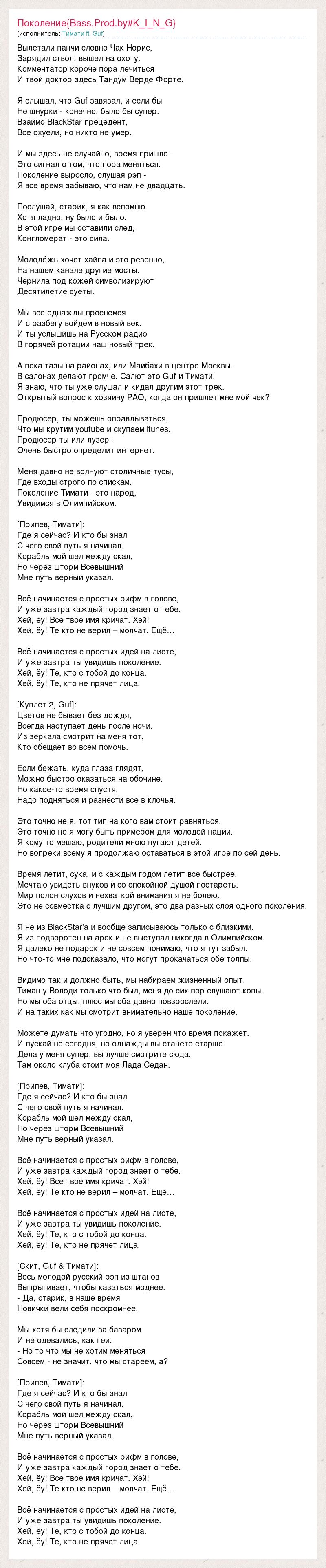 Вылетали панчи словно Чак Норис, Зарядил ствол, вышел на охоту. Комментатор короче пора лечиться И твой доктор здесь Тандум Верде Форте. Я слышал, что Guf завязал, и если бы Не шнурки - конечно, было бы супер. Взаимо BlackStar прецедент, Все охуели, но никто не умер. И мы здесь не случайно, время пришло - Это сигнал о том, что пора меняться. Поколение выросло, слушая рэп - Я все время забываю, что нам не двадцать. Послушай, старик, я как вспомню. Хотя ладно, ну было и было. В этой игре мы оставили след, Конгломерат - это сила. Молодёжь хочет хайпа и это резонно, На нашем канале другие мосты. Чернила под кожей символизируют Десятилетие суеты. Мы все однажды проснемся И с разбегу войдем в новый век. И ты услышишь на Русском радио В горячей ротации наш новый трек. А пока тазы на районах, или Майбахи в центре Москвы. В салонах делают громче. Салют это Guf и Тимати. Я знаю, что ты уже слушал и кидал другим этот трек. Открытый вопрос к хозяину РАО, когда он пришлет мне мой чек? Продюсер, ты можешь оправдываться, Что мы крутим youtube и скупаем itunes. Продюсер ты или лузер - Очень быстро определит интернет. Меня давно не волнуют столичные тусы, Где входы строго по спискам. Поколение Тимати - это народ, Увидимся в Олимпийском. [Припев, Тимати]: Где я сейчас? И кто бы знал С чего свой путь я начинал. Корабль мой шел между скал, Но через шторм Всевышний Мне путь верный указал. Всё начинается с простых рифм в голове, И уже завтра каждый город знает о тебе. Хей, ёу! Все твое имя кричат. Хэй! Хей, ёу! Те кто не верил – молчат. Ещё… Всё начинается с простых идей на листе, И уже завтра ты увидишь поколение. Хей, ёу! Те, кто с тобой до конца. Хей, ёу! Те, кто не прячет лица. [Куплет 2, Guf]: Цветов не бывает без дождя, Всегда наступает день после ночи. Из зеркала смотрит на меня тот, Кто обещает во всем помочь. Если бежать, куда глаза глядят, Можно быстро оказаться на обочине. Но какое-то время спустя, Надо подняться и разнести все в клочья. Это точно не я, тот тип на кого вам стоит равняться. Это точно не я могу быть примером для молодой нации. Я кому то мешаю, родители мною пугают детей. Но вопреки всему я продолжаю оставаться в этой игре по сей день. Время летит, сука, и с каждым годом летит все быстрее. Мечтаю увидеть внуков и со спокойной душой постареть. Мир полон слухов и нехваткой внимания я не болею. Это не совместка с лучшим другом, это два разных слоя одного поколения. Я не из BlackStar'а и вообще записываюсь только с близкими. Я из подворотен на арок и не выступал никогда в Олимпийском. Я далеко не подарок и не совсем понимаю, что я тут забыл. Но что-то мне подсказало, что могут прокачаться обе толпы. Видимо так и должно быть, мы набираем жизненный опыт. Тиман у Володи только что был, меня до сих пор слушают копы. Но мы оба отцы, плюс мы оба давно повзрослели. И на таких как мы смотрит внимательно наше поколение. Можете думать что угодно, но я уверен что время покажет. И пускай не сегодня, но однажды вы станете старше. Дела у меня супер, вы лучше смотрите сюда. Там около клуба стоит моя Лада Седан. [Припев, Тимати]: Где я сейчас? И кто бы знал С чего свой путь я начинал. Корабль мой шел между скал, Но через шторм Всевышний Мне путь верный указал. Всё начинается с простых рифм в голове, И уже завтра каждый город знает о тебе. Хей, ёу! Все твое имя кричат. Хэй! Хей, ёу! Те кто не верил – молчат. Ещё… Всё начинается с простых идей на лис