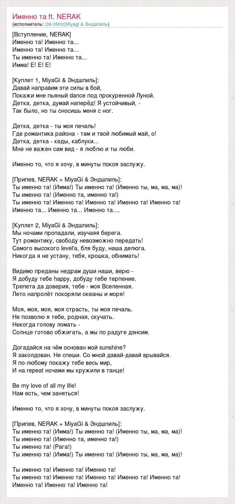 [Вступление, NERAK] Именно та! Именно та... Именно та! Именно та... Ты именно та! Именно та... Имма! Е! Е! Е! [Куплет 1, MiyaGi & Эндшпиль]: Давай направим эти силы в бой, Покажи мне пьяный dаnce под прокуренной Луной. Детка, детка, думай наперёд! Я устойчивый, - Так было, но ты сносишь меня с ног. Детка, детка - ты моя печаль! Где романтика района - там и твой любимый май, о! Детка, детка - кеды, каблуки... Мне не важен сам вид - я люблю и ты люби. Именно то, что я хочу, в минуты покоя заслужу. [Припев, NERAK + MiyaGi & Эндшпиль]: Ты именно та! (Имма!) Ты именно та! (Именно ты, ма, ма, ма)! Ты именно та! (Именно та, именно та!) Ты именно та! Именно та! Именно та! Именно та! Именно та! Именно та... Именно та... Именно та.... [Куплет 2, MiyaGi & Эндшпиль]: Мы ночами пропадали, изучаяя берега. Тут романтику, свободу невозможно передать! Самого высокого level'а, бля буду, наша делюга. Никогда я не устану, тебя, крошка, обнимать! Видимо преданы недрам души наши, верю - Я добуду тебе happy, добуду тебе терпение. Трепета да доверия, тебе - моя Вселенная. Лето напролёт покоряли океаны и моря! Моя, моя, моя, моя страсть, ты моя печаль. Не позволю я тебе, родная, скучать. Некогда голову ломать - Солнце готово обжигать, а мы по радуге дэнсим. Догадайся на чём основан мой sunshine? Я заколдован. Не спеши. Со мной давай-давай врывайся. Я по-любому покажу тебе весь мир, И на repeat ночами мы кружили в танце! Be my love of all my life! Нам есть, чем заняться! Именно то, что я хочу, в минуты покоя заслужу. [Припев, NERAK + MiyaGi & Эндшпиль]: Ты именно та! (Имма!) Ты именно та! (Именно ты, ма, ма, ма)! Ты именно та! (Именно та, именно та!) Ты именно та! (Рага!) Ты именно та! (Имма!) Ты именно та! (Именно ты, ма, ма, ма)! Ты именно та! Именно та! Именно та! Ты именно та! Именно та! Именно та! Именно та! Именно та! Именно та! Именно та! Именно та!