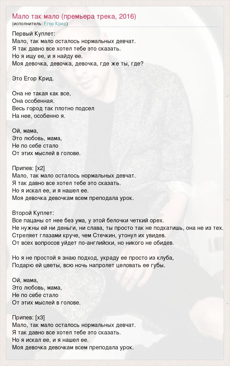 Первый Куплет: Мало, так мало осталось нормальных девчат. Я так давно все хотел тебе это сказать. Но я ищу ее, и я найду ее. Моя девочка, девочка, девочка, где же ты, где? Это Егор Крид. Она не такая как все, Она особенная. Весь город так плотно подсел На нее, особенно я. Ой, мама, Это любовь, мама, Не по себе стало От этих мыслей в голове. Припев: [х2] Мало, так мало осталось нормальных девчат. Я так давно все хотел тебе это сказать. Но я искал ее, и я нашел ее. Моя девочка девочкам всем преподала урок. Второй Куплет: Все пацаны от нее без ума, у этой белочки четкий орех. Не нужны ей ни деньги, ни слава, ты просто так не подкатишь, она не из тех. Стреляет глазами круче, чем Стечкин, утонул их увидев. От всех вопросов уйдет по-английски, но никого не обидев. Но я не простой я знаю подход, украду ее просто из клуба, Подарю ей цветы, всю ночь напролет целовать ее губы. Ой, мама, Это любовь, мама, Не по себе стало От этих мыслей в голове. Припев: [х3] Мало, так мало осталось нормальных девчат. Я так давно все хотел тебе это сказать. Но я искал ее, и я нашел ее. Моя девочка девочкам всем преподала урок.