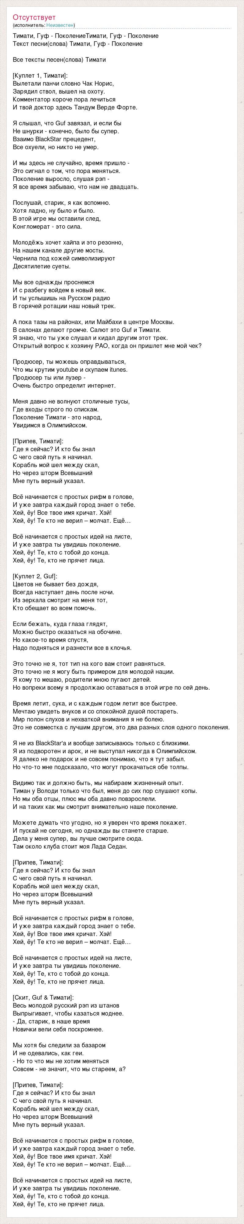 Тимати, Гуф - ПоколениеТимати, Гуф - Поколение Текст песни(слова) Тимати, Гуф - Поколение Все тексты песен(слова) Тимати [Куплет 1, Тимати]: Вылетали панчи словно Чак Норис, Зарядил ствол, вышел на охоту. Комментатор короче пора лечиться И твой доктор здесь Тандум Верде Форте. Я слышал, что Guf завязал, и если бы Не шнурки - конечно, было бы супер. Взаимо BlackStar прецедент, Все охуели, но никто не умер. И мы здесь не случайно, время пришло - Это сигнал о том, что пора меняться. Поколение выросло, слушая рэп - Я все время забываю, что нам не двадцать. Послушай, старик, я как вспомню. Хотя ладно, ну было и было. В этой игре мы оставили след, Конгломерат - это сила. Молодёжь хочет хайпа и это резонно, На нашем канале другие мосты. Чернила под кожей символизируют Десятилетие суеты. Мы все однажды проснемся И с разбегу войдем в новый век. И ты услышишь на Русском радио В горячей ротации наш новый трек. А пока тазы на районах, или Майбахи в центре Москвы. В салонах делают громче. Салют это Guf и Тимати. Я знаю, что ты уже слушал и кидал другим этот трек. Открытый вопрос к хозяину РАО, когда он пришлет мне мой чек? Продюсер, ты можешь оправдываться, Что мы крутим youtube и скупаем itunes. Продюсер ты или лузер - Очень быстро определит интернет. Меня давно не волнуют столичные тусы, Где входы строго по спискам. Поколение Тимати - это народ, Увидимся в Олимпийском. [Припев, Тимати]: Где я сейчас? И кто бы знал С чего свой путь я начинал. Корабль мой шел между скал, Но через шторм Всевышний Мне путь верный указал. Всё начинается с простых рифм в голове, И уже завтра каждый город знает о тебе. Хей, ёу! Все твое имя кричат. Хэй! Хей, ёу! Те кто не верил – молчат. Ещё… Всё начинается с простых идей на листе, И уже завтра ты увидишь поколение. Хей, ёу! Те, кто с тобой до конца. Хей, ёу! Те, кто не прячет лица. [Куплет 2, Guf]: Цветов не бывает без дождя, Всегда наступает день после ночи. Из зеркала смотрит на меня тот, Кто обещает во всем помочь. Если бежать, куда глаза глядят, Можно быстро оказаться на обочине. Но какое-то время спустя, Надо подняться и разнести все в клочья. Это точно не я, тот тип на кого вам стоит равняться. Это точно не я могу быть примером для молодой нации. Я кому то мешаю, родители мною пугают детей. Но вопреки всему я продолжаю оставаться в этой игре по сей день. Время летит, сука, и с каждым годом летит все быстрее. Мечтаю увидеть внуков и со спокойной душой постареть. Мир полон слухов и нехваткой внимания я не болею. Это не совместка с лучшим другом, это два разных слоя одного поколения. Я не из BlackStar'а и вообще записываюсь только с близкими. Я из подворотен и арок, и не выступал никогда в Олимпийском. Я далеко не подарок и не совсем понимаю, что я тут забыл. Но что-то мне подсказало, что могут прокачаться обе толпы. Видимо так и должно быть, мы набираем жизненный опыт. Тиман у Володи только что был, меня до сих пор слушают копы. Но мы оба отцы, плюс мы оба давно повзрослели. И на таких как мы смотрит внимательно наше поколение. Можете думать что угодно, но я уверен что время покажет. И пускай не сегодня, но однажды вы станете старше. Дела у меня супер, вы лучше смотрите сюда. Там около клуба стоит моя Лада Седан. [Припев, Тимати]: Где я сейчас? И кто бы знал С чего свой путь я начинал. Корабль мой шел между скал, Но через шторм Всевышний Мне путь верный указал. Всё начинается с простых рифм в голове, И уже завтр