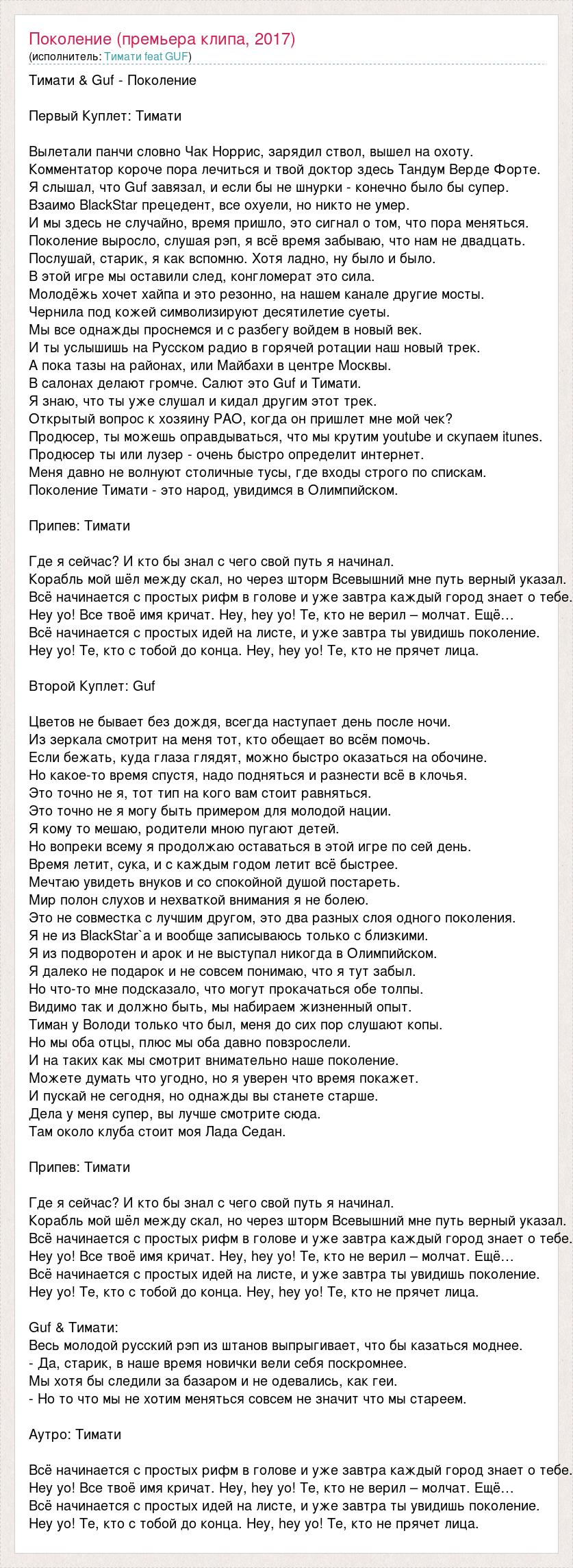 Тимати & Guf - Поколение Первый Куплет: Тимати Вылетали панчи словно Чак Норрис, зарядил ствол, вышел на охоту. Комментатор короче пора лечиться и твой доктор здесь Тандум Верде Форте. Я слышал, что Guf завязал, и если бы не шнурки - конечно было бы супер. Взаимо BlackStar прецедент, все охуели, но никто не умер. И мы здесь не случайно, время пришло, это сигнал о том, что пора меняться. Поколение выросло, слушая рэп, я всё время забываю, что нам не двадцать. Послушай, старик, я как вспомню. Хотя ладно, ну было и было. В этой игре мы оставили след, конгломерат это сила. Молодёжь хочет хайпа и это резонно, на нашем канале другие мосты. Чернила под кожей символизируют десятилетие суеты. Мы все однажды проснемся и с разбегу войдем в новый век. И ты услышишь на Русском радио в горячей ротации наш новый трек. А пока тазы на районах, или Майбахи в центре Москвы. В салонах делают громче. Салют это Guf и Тимати. Я знаю, что ты уже слушал и кидал другим этот трек. Открытый вопрос к хозяину РАО, когда он пришлет мне мой чек? Продюсер, ты можешь оправдываться, что мы крутим youtube и скупаем itunes. Продюсер ты или лузер - очень быстро определит интернет. Меня давно не волнуют столичные тусы, где входы строго по спискам. Поколение Тимати - это народ, увидимся в Олимпийском. Припев: Тимати Где я сейчас? И кто бы знал с чего свой путь я начинал. Корабль мой шёл между скал, но через шторм Всевышний мне путь верный указал. Всё начинается с простых рифм в голове и уже завтра каждый город знает о тебе. Hey yo! Все твоё имя кричат. Hey, hey yo! Те, кто не верил – молчат. Ещё… Всё начинается с простых идей на листе, и уже завтра ты увидишь поколение. Hey yo! Те, кто с тобой до конца. Hey, hey yo! Те, кто не прячет лица. Второй Куплет: Guf Цветов не бывает без дождя, всегда наступает день после ночи. Из зеркала смотрит на меня тот, кто обещает во всём помочь. Если бежать, куда глаза глядят, можно быстро оказаться на обочине. Но какое-то время спустя, надо подняться и разнести всё в клочья. Это точно не я, тот тип на кого вам стоит равняться. Это точно не я могу быть примером для молодой нации. Я кому то мешаю, родители мною пугают детей. Но вопреки всему я продолжаю оставаться в этой игре по сей день. Время летит, сука, и с каждым годом летит всё быстрее. Мечтаю увидеть внуков и со спокойной душой постареть. Мир полон слухов и нехваткой внимания я не болею. Это не совместка с лучшим другом, это два разных слоя одного поколения. Я не из BlackStar`а и вообще записываюсь только с близкими. Я из подворотен и арок и не выступал никогда в Олимпийском. Я далеко не подарок и не совсем понимаю, что я тут забыл. Но что-то мне подсказало, что могут прокачаться обе толпы. Видимо так и должно быть, мы набираем жизненный опыт. Тиман у Володи только что был, меня до сих пор слушают копы. Но мы оба отцы, плюс мы оба давно повзрослели. И на таких как мы смотрит внимательно наше поколение. Можете думать что угодно, но я уверен что время покажет. И пускай не сегодня, но однажды вы станете старше. Дела у меня супер, вы лучше смотрите сюда. Там около клуба стоит моя Лада Седан. Припев: Тимати Где я сейчас? И кто бы знал с чего свой путь я начинал. Корабль мой шёл между скал, но через шторм Всевышний мне путь верный указал. Всё начинается с простых рифм в голове и уже завтра каждый город знает о тебе. Hey yo! Все твоё имя кричат. Hey, hey yo! Те, кто не верил – молчат. Ещё… Всё начинается