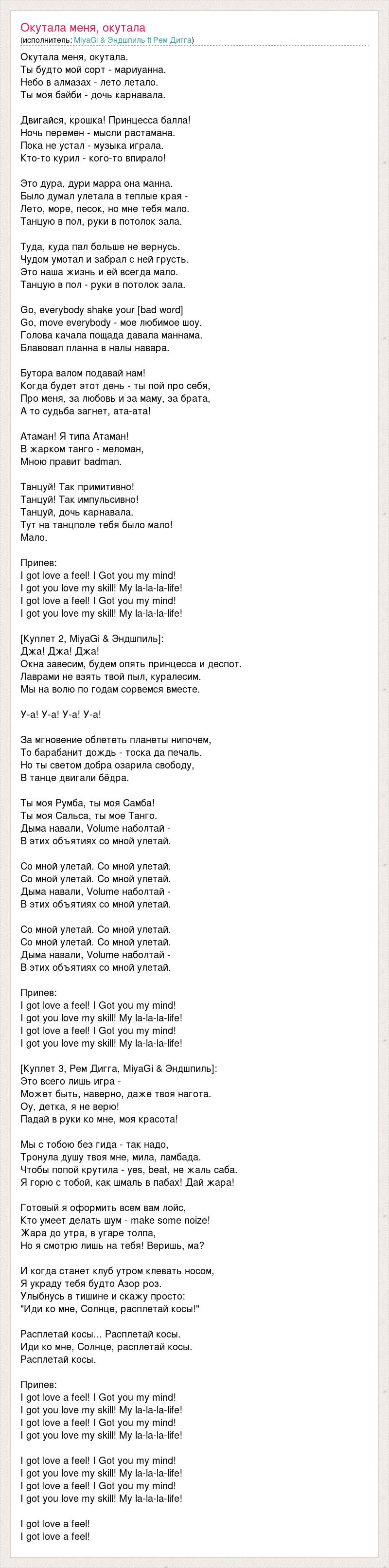Окутала меня, окутала. Ты будто мой сорт - мариуанна. Небо в алмазах - лето летало. Ты моя бэйби - дочь карнавала. Двигайся, крошка! Принцесса балла! Ночь перемен - мысли растамана. Пока не устал - музыка играла. Кто-то курил - кого-то впирало! Это дура, дури марра она манна. Было думал улетала в теплые края - Лето, море, песок, но мне тебя мало. Танцую в пол, руки в потолок зала. Туда, куда пал больше не вернусь. Чудом умотал и забрал с ней грусть. Это наша жизнь и ей всегда мало. Танцую в пол - руки в потолок зала. Go, everybody shake your [bad word] Go, move everybody - мое любимое шоу. Голова качала пощада давала маннама. Блавовал планна в налы навара. Бутора валом подавай нам! Когда будет этот день - ты пой про себя, Про меня, за любовь и за маму, за брата, А то судьба загнет, ата-ата! Атаман! Я типа Атаман! В жарком танго - меломан, Мною правит badman. Танцуй! Так примитивно! Танцуй! Так импульсивно! Танцуй, дочь карнавала. Тут на танцполе тебя было мало! Мало. Припев: I got love a feel! I Got you my mind! I got you love my skill! My la-la-la-life! I got love a feel! I Got you my mind! I got you love my skill! My la-la-la-life! [Куплет 2, MiyaGi & Эндшпиль]: Джа! Джа! Джа! Окна завесим, будем опять принцесса и деспот. Лаврами не взять твой пыл, куралесим. Мы на волю по годам сорвемся вместе. У-а! У-а! У-а! У-а! За мгновение облететь планеты нипочем, То барабанит дождь - тоска да печаль. Но ты светом добра озарила свободу, В танце двигали бёдра. Ты моя Румба, ты моя Самба! Ты моя Сальса, ты мое Танго. Дыма навали, Volume наболтай - В этих объятиях со мной улетай. Со мной улетай. Со мной улетай. Со мной улетай. Со мной улетай. Дыма навали, Volume наболтай - В этих объятиях со мной улетай. Со мной улетай. Со мной улетай. Со мной улетай. Со мной улетай. Дыма навали, Volume наболтай - В этих объятиях со мной улетай. Припев: I got love a feel! I Got you my mind! I got you love my skill! My la-la-la-life! I got love a feel! I Got you my mind! I got you love my skill! My la-la-la-life! [Куплет 3, Рем Дигга, MiyaGi & Эндшпиль]: Это всего лишь игра - Может быть, наверно, даже твоя нагота. Оу, детка, я не верю! Падай в руки ко мне, моя красота! Мы с тобою без гида - так надо, Тронула душу твоя мне, мила, ламбада. Чтобы попой крутила - yes, beat, не жаль саба. Я горю с тобой, как шмаль в пабах! Дай жара! Готовый я оформить всем вам лойс, Кто умеет делать шум - make some noize! Жара до утра, в угаре толпа, Но я смотрю лишь на тебя! Веришь, ма? И когда станет клуб утром клевать носом, Я украду тебя будто Азор роз. Улыбнусь в тишине и скажу просто: "Иди ко мне, Солнце, расплетай косы!" Расплетай косы... Расплетай косы. Иди ко мне, Солнце, расплетай косы. Расплетай косы. Припев: I got love a feel! I Got you my mind! I got you love my skill! My la-la-la-life! I got love a feel! I Got you my mind! I got you love my skill! My la-la-la-life! I got love a feel! I Got you my mind! I got you love my skill! My la-la-la-life! I got love a feel! I Got you my mind! I got you love my skill! My la-la-la-life! I got love a feel! I got love a feel!