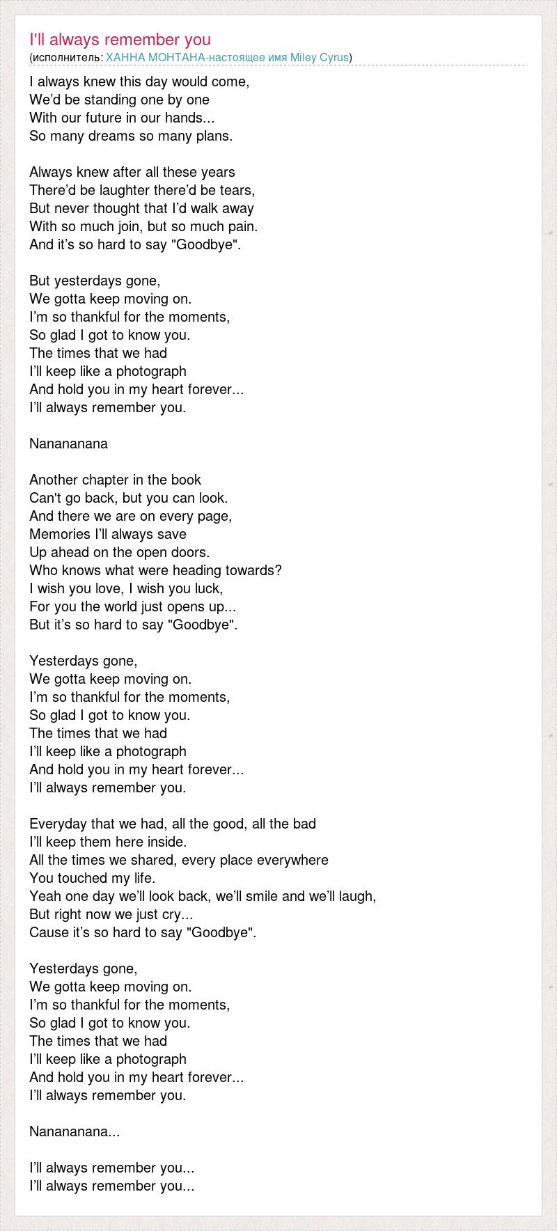 I always knew this day would come, We’d be standing one by one With our future in our hands... So many dreams so many plans. Always knew after all these years There’d be laughter there’d be tears, But never thought that I’d walk away With so much join, but so much pain. And it’s so hard to say "Goodbye". But yesterdays gone, We gotta keep moving on. I’m so thankful for the moments, So glad I got to know you. The times that we had I’ll keep like a photograph And hold you in my heart forever... I’ll always remember you. Nanananana Another chapter in the book Can't go back, but you can look. And there we are on every page, Memories I’ll always save Up ahead on the open doors. Who knows what were heading towards? I wish you love, I wish you luck, For you the world just opens up... But it’s so hard to say "Goodbye". Yesterdays gone, We gotta keep moving on. I’m so thankful for the moments, So glad I got to know you. The times that we had I’ll keep like a photograph And hold you in my heart forever... I’ll always remember you. Everyday that we had, all the good, all the bad I’ll keep them here inside. All the times we shared, every place everywhere You touched my life. Yeah one day we’ll look back, we’ll smile and we’ll laugh, But right now we just cry... Cause it’s so hard to say "Goodbye". Yesterdays gone, We gotta keep moving on. I’m so thankful for the moments, So glad I got to know you. The times that we had I’ll keep like a photograph And hold you in my heart forever... I’ll always remember you. Nanananana... I’ll always remember you... I’ll always remember you...