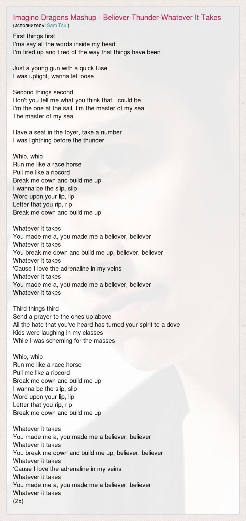 First things first I'ma say all the words inside my head I'm fired up and tired of the way that things have been Just a young gun with a quick fuse I was uptight, wanna let loose Second things second Don't you tell me what you think that I could be I'm the one at the sail, I'm the master of my sea The master of my sea Have a seat in the foyer, take a number I was lightning before the thunder Whip, whip Run me like a race horse Pull me like a ripcord Break me down and build me up I wanna be the slip, slip Word upon your lip, lip Letter that you rip, rip Break me down and build me up Whatever it takes You made me a, you made me a believer, believer Whatever it takes You break me down and build me up, believer, believer Whatever it takes 'Cause I love the adrenaline in my veins Whatever it takes You made me a, you made me a believer, believer Whatever it takes Third things third Send a prayer to the ones up above All the hate that you've heard has turned your spirit to a dove Kids were laughing in my classes While I was scheming for the masses Whip, whip Run me like a race horse Pull me like a ripcord Break me down and build me up I wanna be the slip, slip Word upon your lip, lip Letter that you rip, rip Break me down and build me up Whatever it takes You made me a, you made me a believer, believer Whatever it takes You break me down and build me up, believer, believer Whatever it takes 'Cause I love the adrenaline in my veins Whatever it takes You made me a, you made me a believer, believer Whatever it takes (2x)