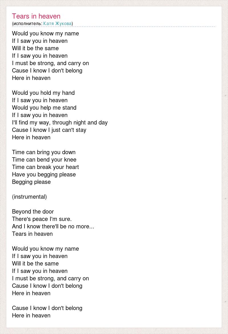 Would you know my name If I saw you in heaven Will it be the same If I saw you in heaven I must be strong, and carry on Cause I know I don't belong Here in heaven Would you hold my hand If I saw you in heaven Would you help me stand If I saw you in heaven I'll find my way, through night and day Cause I know I just can't stay Here in heaven Time can bring you down Time can bend your knee Time can break your heart Have you begging please Begging please (instrumental) Beyond the door There's peace I'm sure. And I know there'll be no more... Tears in heaven Would you know my name If I saw you in heaven Will it be the same If I saw you in heaven I must be strong, and carry on Cause I know I don't belong Here in heaven Cause I know I don't belong Here in heaven