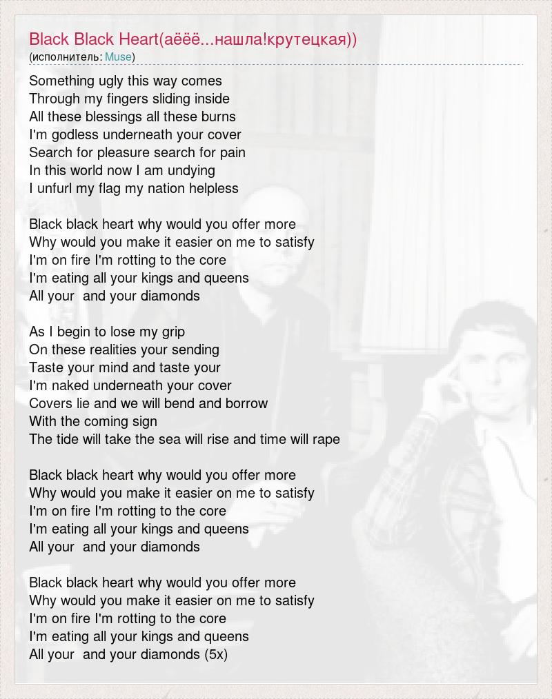 Something ugly this way comes Through my fingers sliding inside All these blessings all these burns I'm godless underneath your cover Search for pleasure search for pain In this world now I am undying I unfurl my flag my nation helpless Black black heart why would you offer more Why would you make it easier on me to satisfy I'm on fire I'm rotting to the core I'm eating all your kings and queens All your and your diamonds As I begin to lose my grip On these realities your sending Taste your mind and taste your I'm naked underneath your cover Covers lie and we will bend and borrow With the coming sign The tide will take the sea will rise and time will rape Black black heart why would you offer more Why would you make it easier on me to satisfy I'm on fire I'm rotting to the core I'm eating all your kings and queens All your and your diamonds Black black heart why would you offer more Why would you make it easier on me to satisfy I'm on fire I'm rotting to the core I'm eating all your kings and queens All your and your diamonds (5х)
