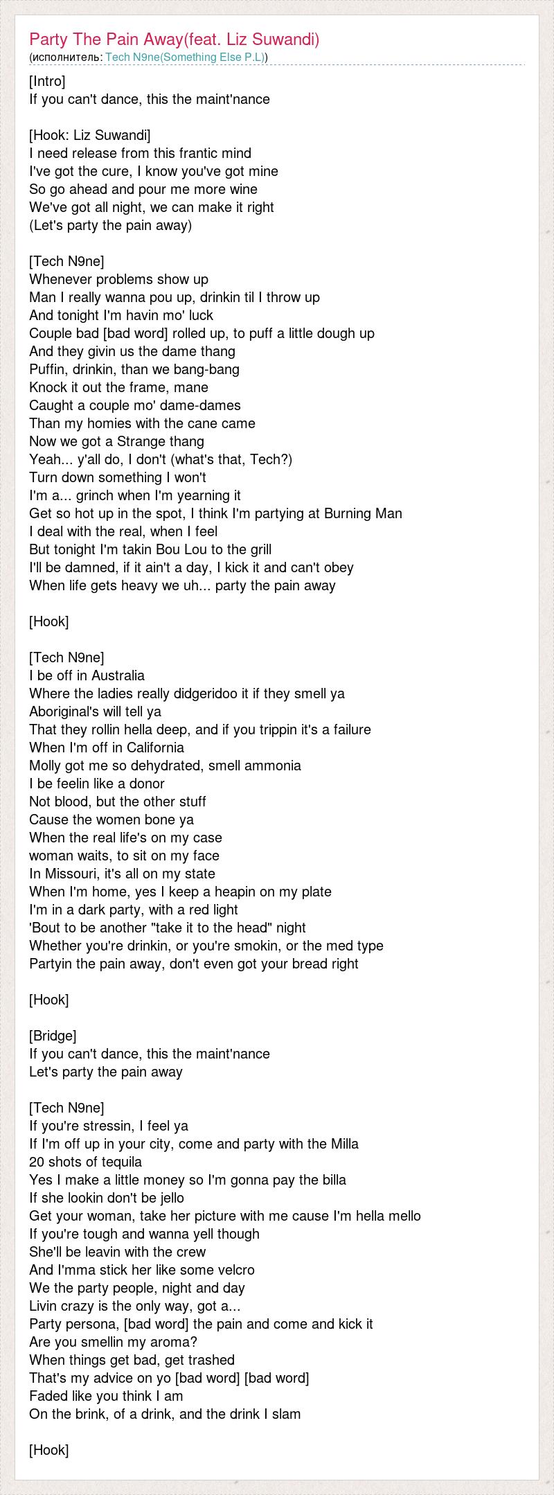 [Intro] If you can't dance, this the maint'nance [Hook: Liz Suwandi] I need release from this frantic mind I've got the cure, I know you've got mine So go ahead and pour me more wine We've got all night, we can make it right (Let's party the pain away) [Tech N9ne] Whenever problems show up Man I really wanna pou up, drinkin til I throw up And tonight I'm havin mo' luck Couple bad [bad word] rolled up, to puff a little dough up And they givin us the dame thang Puffin, drinkin, than we bang-bang Knock it out the frame, mane Caught a couple mo' dame-dames Than my homies with the cane came Now we got a Strange thang Yeah... y'all do, I don't (what's that, Tech?) Turn down something I won't I'm a... grinch when I'm yearning it Get so hot up in the spot, I think I'm partying at Burning Man I deal with the real, when I feel But tonight I'm takin Bou Lou to the grill I'll be damned, if it ain't a day, I kick it and can't obey When life gets heavy we uh... party the pain away [Hook] [Tech N9ne] I be off in Australia Where the ladies really didgeridoo it if they smell ya Aboriginal's will tell ya That they rollin hella deep, and if you trippin it's a failure When I'm off in California Molly got me so dehydrated, smell ammonia I be feelin like a donor Not blood, but the other stuff Cause the women bone ya When the real life's on my case woman waits, to sit on my face In Missouri, it's all on my state When I'm home, yes I keep a heapin on my plate I'm in a dark party, with a red light 'Bout to be another "take it to the head" night Whether you're drinkin, or you're smokin, or the med type Partyin the pain away, don't even got your bread right [Hook] [Bridge] If you can't dance, this the maint'nance Let's party the pain away [Tech N9ne] If you're stressin, I feel ya If I'm off up in your city, come and party with the Milla 20 shots of tequila Yes I make a little money so I'm gonna pay the billa If she lookin don't be jello Get your woman, take her picture with me cause I'm hella mello If you're tough and wanna yell though She'll be leavin with the crew And I'mma stick her like some velcro We the party people, night and day Livin crazy is the only way, got a... Party persona, [bad word] the pain and come and kick it Are you smellin my aroma? When things get bad, get trashed That's my advice on yo [bad word] [bad word] Faded like you think I am On the brink, of a drink, and the drink I slam [Hook]