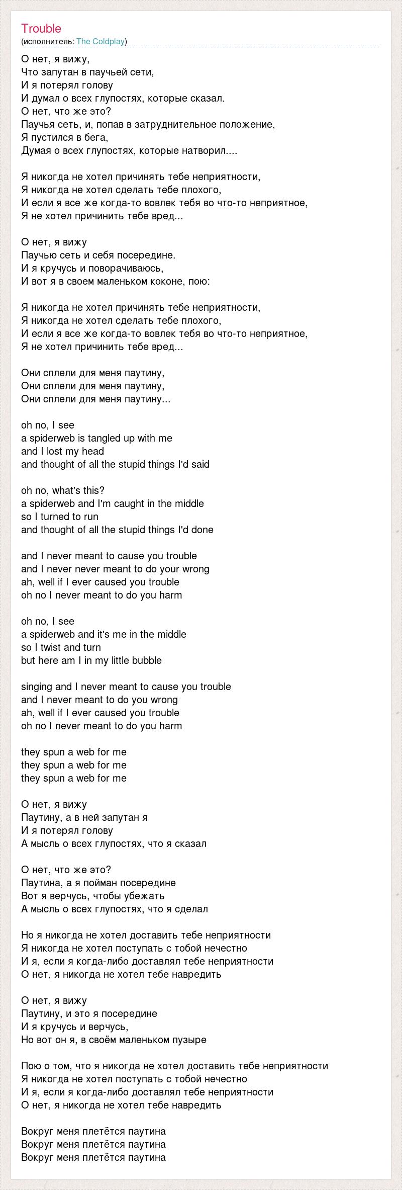 О нет, я вижу, Что запутан в паучьей сети, И я потерял голову И думал о всех глупостях, которые сказал. О нет, что же это? Паучья сеть, и, попав в затруднительное положение, Я пустился в бега, Думая о всех глупостях, которые натворил.... Я никогда не хотел причинять тебе неприятности, Я никогда не хотел сделать тебе плохого, И если я все же когда-то вовлек тебя во что-то неприятное, Я не хотел причинить тебе вред... О нет, я вижу Паучью сеть и себя посередине. И я кручусь и поворачиваюсь, И вот я в своем маленьком коконе, пою: Я никогда не хотел причинять тебе неприятности, Я никогда не хотел сделать тебе плохого, И если я все же когда-то вовлек тебя во что-то неприятное, Я не хотел причинить тебе вред... Они сплели для меня паутину, Они сплели для меня паутину, Они сплели для меня паутину... oh no, I see a spiderweb is tangled up with me and I lost my head and thought of all the stupid things I'd said oh no, what's this? a spiderweb and I'm caught in the middle so I turned to run and thought of all the stupid things I'd done and I never meant to cause you trouble and I never never meant to do your wrong ah, well if I ever caused you trouble oh no I never meant to do you harm oh no, I see a spiderweb and it's me in the middle so I twist and turn but here am I in my little bubble singing and I never meant to cause you trouble and I never meant to do you wrong ah, well if I ever caused you trouble oh no I never meant to do you harm they spun a web for me they spun a web for me they spun a web for me О нет, я вижу Паутину, а в ней запутан я И я потерял голову А мысль о всех глупостях, что я сказал О нет, что же это? Паутина, а я пойман посередине Вот я верчусь, чтобы убежать А мысль о всех глупостях, что я сделал Но я никогда не хотел доставить тебе неприятности Я никогда не хотел поступать с тобой нечестно И я, если я когда-либо доставлял тебе неприятности О нет, я никогда не хотел тебе навредить О нет, я вижу Паутину, и это я посередине И я кручусь и верчусь, Но вот он я, в своём маленьком пузыре Пою о том, что я никогда не хотел доставить тебе неприятности Я никогда не хотел поступать с тобой нечестно И я, если я когда-либо доставлял тебе неприятности О нет, я никогда не хотел тебе навредить Вокруг меня плетётся паутина Вокруг меня плетётся паутина Вокруг меня плетётся паутина