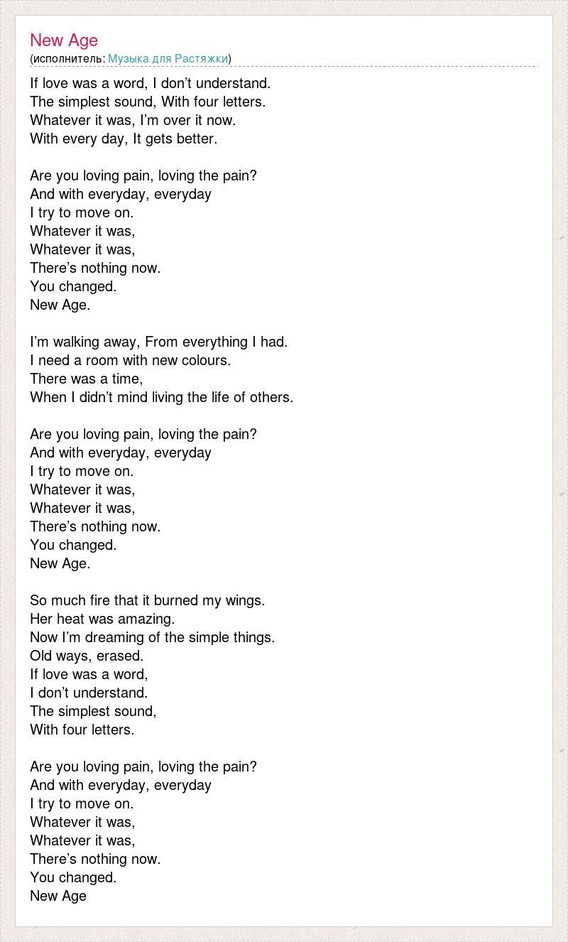If love was a word, I don’t understand. The simplest sound, With four letters. Whatever it was, I’m over it now. With every day, It gets better. Are you loving pain, loving the pain? And with everyday, everyday I try to move on. Whatever it was, Whatever it was, There’s nothing now. You changed. New Age. I’m walking away, From everything I had. I need a room with new colours. There was a time, When I didn’t mind living the life of others. Are you loving pain, loving the pain? And with everyday, everyday I try to move on. Whatever it was, Whatever it was, There’s nothing now. You changed. New Age. So much fire that it burned my wings. Her heat was amazing. Now I’m dreaming of the simple things. Old ways, erased. If love was a word, I don’t understand. The simplest sound, With four letters. Are you loving pain, loving the pain? And with everyday, everyday I try to move on. Whatever it was, Whatever it was, There’s nothing now. You changed. New Age