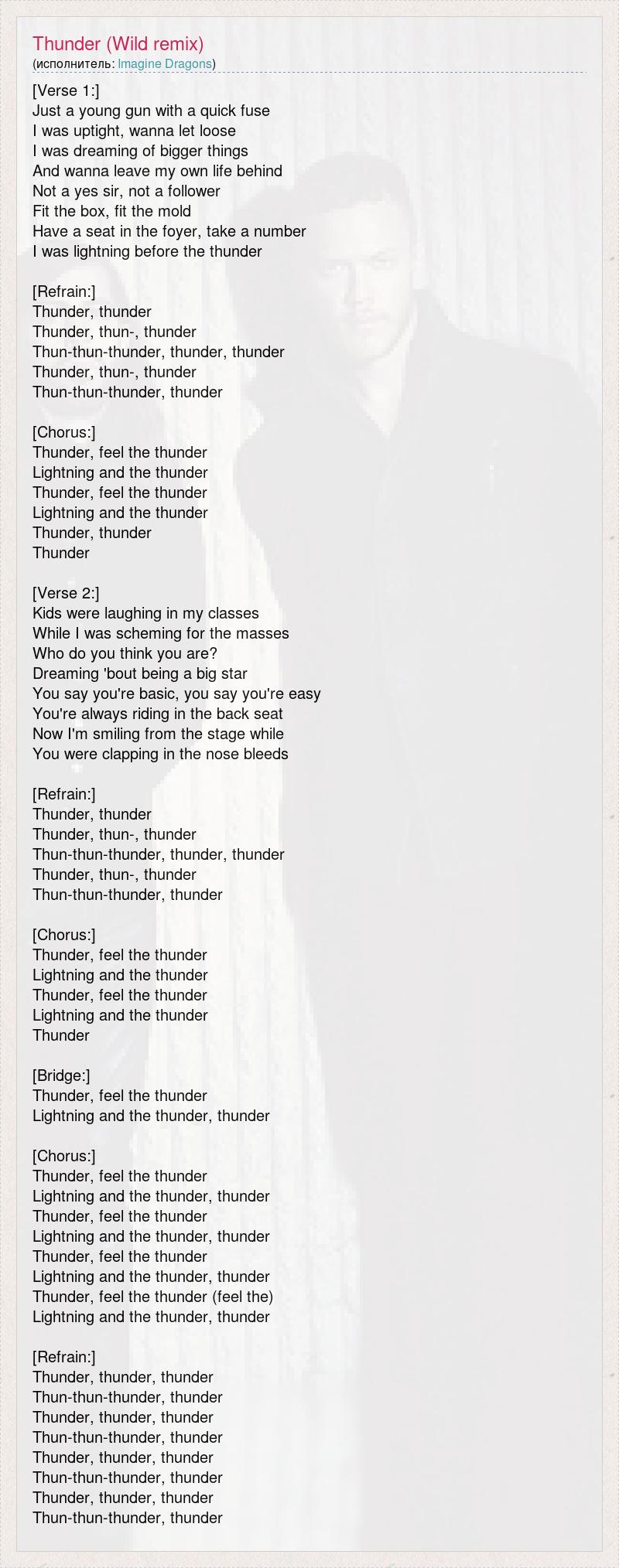 [Verse 1:] Just a young gun with a quick fuse I was uptight, wanna let loose I was dreaming of bigger things And wanna leave my own life behind Not a yes sir, not a follower Fit the box, fit the mold Have a seat in the foyer, take a number I was lightning before the thunder [Refrain:] Thunder, thunder Thunder, thun-, thunder Thun-thun-thunder, thunder, thunder Thunder, thun-, thunder Thun-thun-thunder, thunder [Chorus:] Thunder, feel the thunder Lightning and the thunder Thunder, feel the thunder Lightning and the thunder Thunder, thunder Thunder [Verse 2:] Kids were laughing in my classes While I was scheming for the masses Who do you think you are? Dreaming 'bout being a big star You say you're basic, you say you're easy You're always riding in the back seat Now I'm smiling from the stage while You were clapping in the nose bleeds [Refrain:] Thunder, thunder Thunder, thun-, thunder Thun-thun-thunder, thunder, thunder Thunder, thun-, thunder Thun-thun-thunder, thunder [Chorus:] Thunder, feel the thunder Lightning and the thunder Thunder, feel the thunder Lightning and the thunder Thunder [Bridge:] Thunder, feel the thunder Lightning and the thunder, thunder [Chorus:] Thunder, feel the thunder Lightning and the thunder, thunder Thunder, feel the thunder Lightning and the thunder, thunder Thunder, feel the thunder Lightning and the thunder, thunder Thunder, feel the thunder (feel the) Lightning and the thunder, thunder [Refrain:] Thunder, thunder, thunder Thun-thun-thunder, thunder Thunder, thunder, thunder Thun-thun-thunder, thunder Thunder, thunder, thunder Thun-thun-thunder, thunder Thunder, thunder, thunder Thun-thun-thunder, thunder