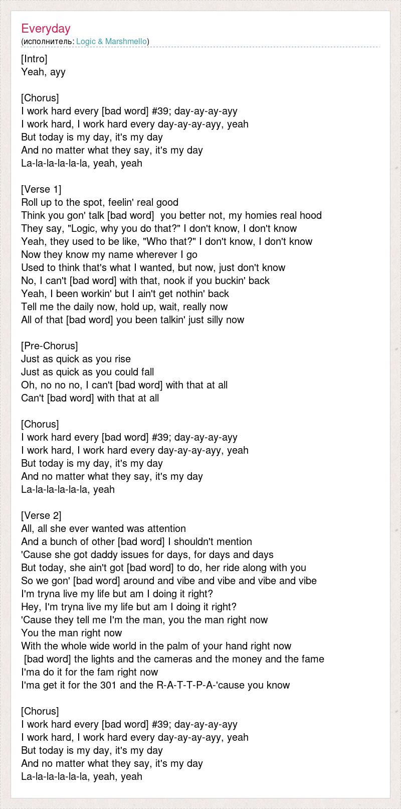 [Intro] Yeah, ayy [Chorus] I work hard every [bad word] #39; day-ay-ay-ayy I work hard, I work hard every day-ay-ay-ayy, yeah But today is my day, it's my day And no matter what they say, it's my day La-la-la-la-la-la, yeah, yeah [Verse 1] Roll up to the spot, feelin' real good Think you gon' talk [bad word] you better not, my homies real hood They say, "Logic, why you do that?" I don't know, I don't know Yeah, they used to be like, "Who that?" I don't know, I don't know Now they know my name wherever I go Used to think that's what I wanted, but now, just don't know No, I can't [bad word] with that, nook if you buckin' back Yeah, I been workin' but I ain't get nothin' back Tell me the daily now, hold up, wait, really now All of that [bad word] you been talkin' just silly now [Pre-Chorus] Just as quick as you rise Just as quick as you could fall Oh, no no no, I can't [bad word] with that at all Can't [bad word] with that at all [Chorus] I work hard every [bad word] #39; day-ay-ay-ayy I work hard, I work hard every day-ay-ay-ayy, yeah But today is my day, it's my day And no matter what they say, it's my day La-la-la-la-la-la, yeah [Verse 2] All, all she ever wanted was attention And a bunch of other [bad word] I shouldn't mention 'Cause she got daddy issues for days, for days and days But today, she ain't got [bad word] to do, her ride along with you So we gon' [bad word] around and vibe and vibe and vibe and vibe I'm tryna live my life but am I doing it right? Hey, I'm tryna live my life but am I doing it right? 'Cause they tell me I'm the man, you the man right now You the man right now With the whole wide world in the palm of your hand right now [bad word] the lights and the cameras and the money and the fame I'ma do it for the fam right now I'ma get it for the 301 and the R-A-T-T-P-A-'cause you know [Chorus] I work hard every [bad word] #39; day-ay-ay-ayy I work hard, I work hard every day-ay-ay-ayy, yeah But today is my day, it's my day And no matter what they say, it's my day La-la-la-la-la-la, yeah, yeah