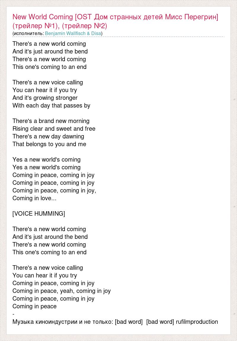 There's a new world coming And it's just around the bend There's a new world coming This one's coming to an end There's a new voice calling You can hear it if you try And it's growing stronger With each day that passes by There's a brand new morning Rising clear and sweet and free There's a new day dawning That belongs to you and me Yes a new world's coming Yes a new world's coming Coming in peace, coming in joy Coming in peace, coming in joy Coming in peace, coming in joy, Coming in love... [VOICE HUMMING] There's a new world coming And it's just around the bend There's a new world coming This one's coming to an end There's a new voice calling You can hear it if you try Coming in peace, coming in joy Coming in peace, yeah, coming in joy Coming in peace, coming in joy Coming in peace - Музыка киноиндустрии и не только: [bad word] [bad word] rufilmproduction