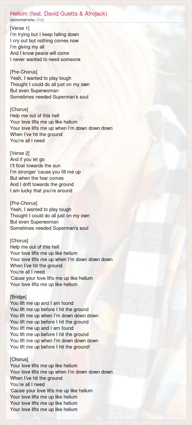[Verse 1] I’m trying but I keep falling down I cry out but nothing comes now I’m giving my all And I know peace will come I never wanted to need someone [Pre-Chorus] Yeah, I wanted to play tough Thought I could do all just on my own But even Superwoman Sometimes needed Superman’s soul [Chorus] Help me out of this hell Your love lifts me up like helium Your love lifts me up when I’m down down down When I’ve hit the ground You’re all I need [Verse 2] And if you let go I’ll float towards the sun I’m stronger ’cause you fill me up But when the fear comes And I drift towards the ground I am lucky that you’re around [Pre-Chorus] Yeah, I wanted to play tough Thought I could do all just on my own But even Superwoman Sometimes needed Superman’s soul [Chorus] Help me out of this hell Your love lifts me up like helium Your love lifts me up when I’m down down down When I’ve hit the ground You’re all I need ‘Cause your love lifts me up like helium Your love lifts me up like helium [Bridge] You lift me up and I am found You lift me up before I hit the ground You lift me up when I’m down down down You lift me up before I hit the ground You lift me up and I am found You lift me up before I hit the ground You lift me up when I’m down down down You lift me up before I hit the ground! [Chorus] Your love lifts me up like helium Your love lifts me up when I’m down down down When I’ve hit the ground You’re all I need ‘Cause your love lifts me up like helium Your love lifts me up like helium Your love lifts me up like helium Your love lifts me up like helium