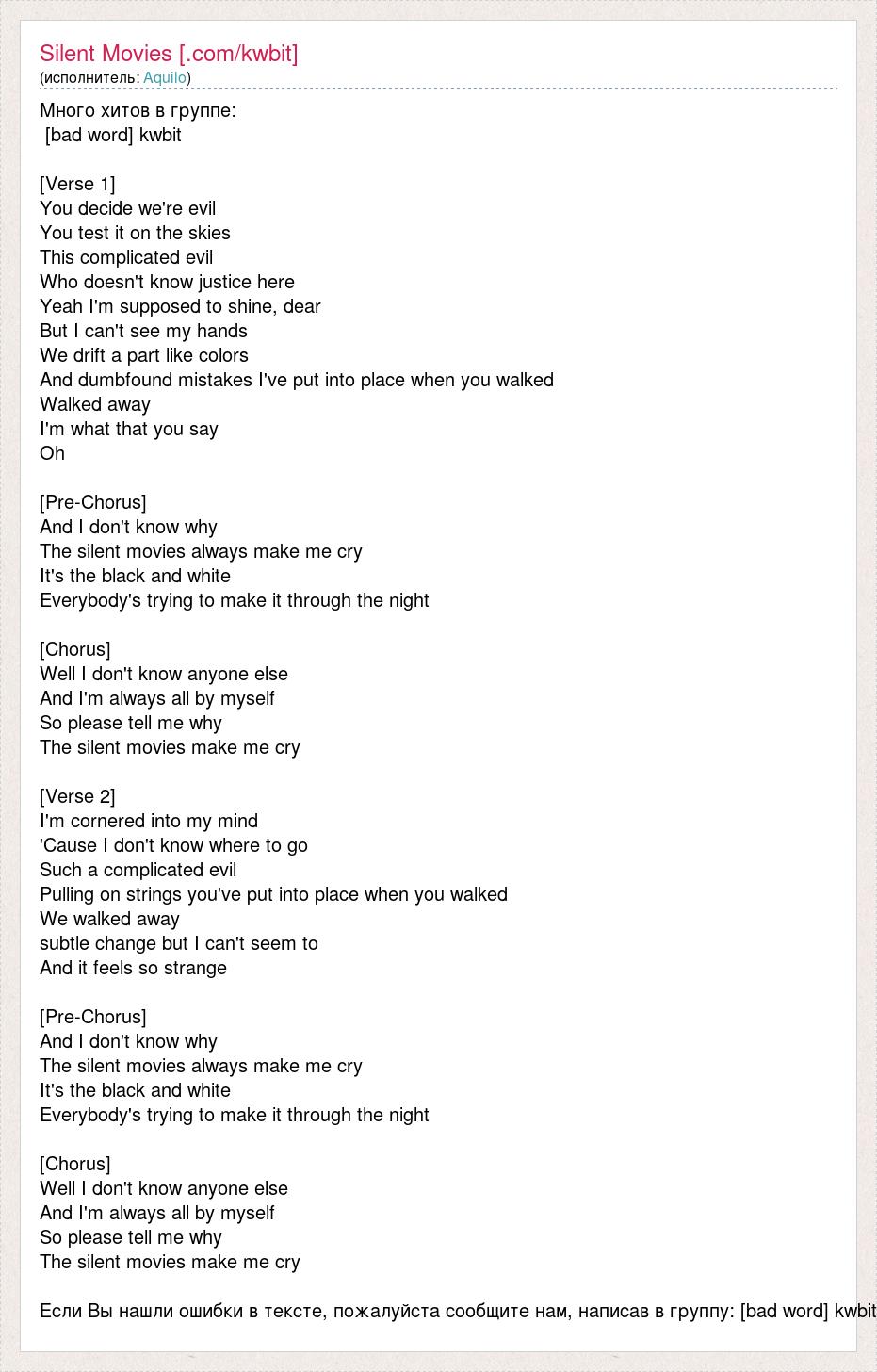 Много хитов в группе: [bad word] kwbit [Verse 1] You decide we're evil You test it on the skies This complicated evil Who doesn't know justice here Yeah I'm supposed to shine, dear But I can't see my hands We drift a part like colors And dumbfound mistakes I've put into place when you walked Walked away I'm what that you say Oh [Pre-Chorus] And I don't know why The silent movies always make me cry It's the black and white Everybody's trying to make it through the night [Chorus] Well I don't know anyone else And I'm always all by myself So please tell me why The silent movies make me cry [Verse 2] I'm cornered into my mind 'Cause I don't know where to go Such a complicated evil Pulling on strings you've put into place when you walked We walked away subtle change but I can't seem to And it feels so strange [Pre-Chorus] And I don't know why The silent movies always make me cry It's the black and white Everybody's trying to make it through the night [Chorus] Well I don't know anyone else And I'm always all by myself So please tell me why The silent movies make me cry Если Вы нашли ошибки в тексте, пожалуйста сообщите нам, написав в группу: [bad word] kwbit