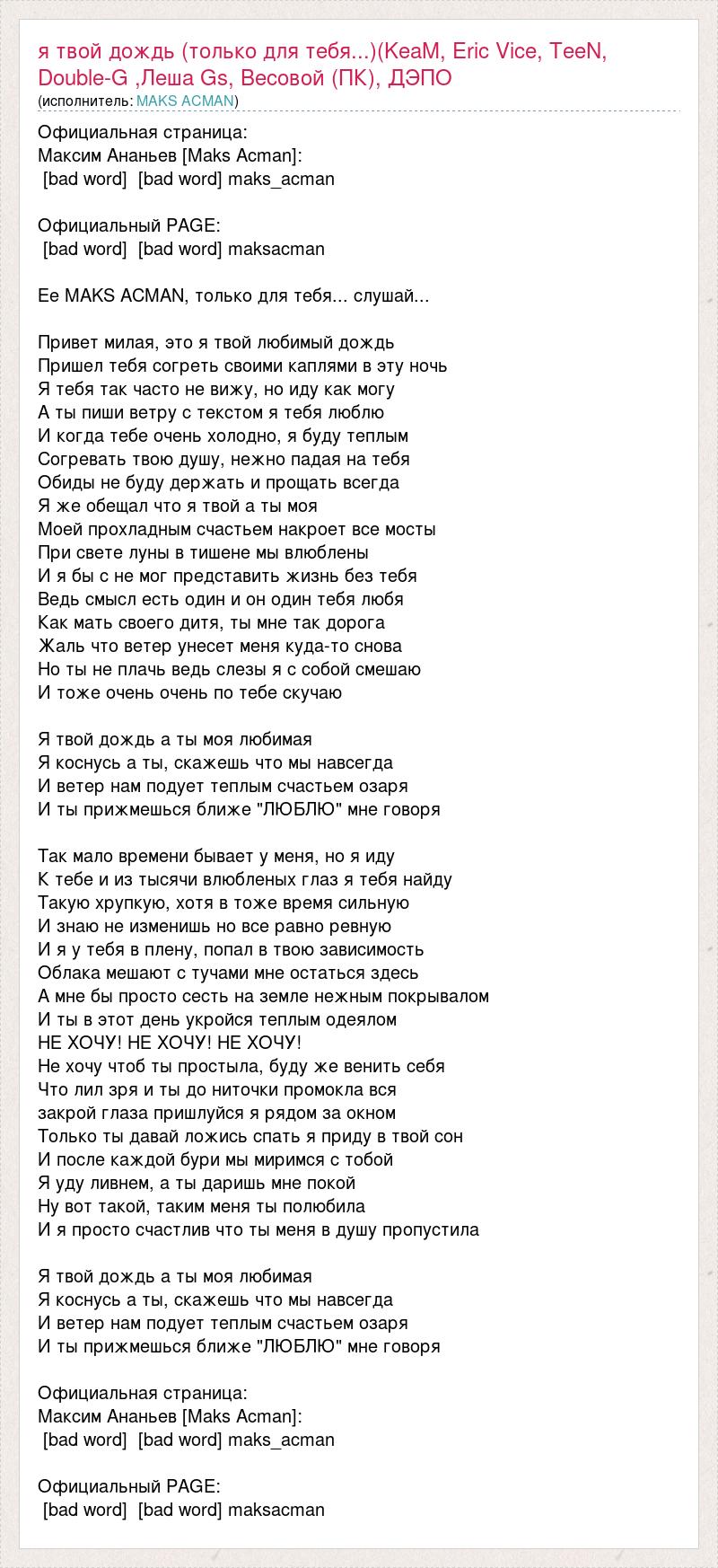 Официальная страница: Максим Ананьев [Maks Acman]: [bad word] [bad word] maks_acman Официальный PAGE: [bad word] [bad word] maksacman Ее MAKS ACMAN, только для тебя... слушай... Привет милая, это я твой любимый дождь Пришел тебя согреть своими каплями в эту ночь Я тебя так часто не вижу, но иду как могу А ты пиши ветру с текстом я тебя люблю И когда тебе очень холодно, я буду теплым Согревать твою душу, нежно падая на тебя Обиды не буду держать и прощать всегда Я же обещал что я твой а ты моя Моей прохладным счастьем накроет все мосты При свете луны в тишене мы влюблены И я бы с не мог представить жизнь без тебя Ведь смысл есть один и он один тебя любя Как мать своего дитя, ты мне так дорога Жаль что ветер унесет меня куда-то снова Но ты не плачь ведь слезы я с собой смешаю И тоже очень очень по тебе скучаю Я твой дождь а ты моя любимая Я коснусь а ты, скажешь что мы навсегда И ветер нам подует теплым счастьем озаря И ты прижмешься ближе "ЛЮБЛЮ" мне говоря Так мало времени бывает у меня, но я иду К тебе и из тысячи влюбленых глаз я тебя найду Такую хрупкую, хотя в тоже время сильную И знаю не изменишь но все равно ревную И я у тебя в плену, попал в твою зависимость Облака мешают с тучами мне остаться здесь А мне бы просто сесть на земле нежным покрывалом И ты в этот день укройся теплым одеялом НЕ ХОЧУ! НЕ ХОЧУ! НЕ ХОЧУ! Не хочу чтоб ты простыла, буду же венить себя Что лил зря и ты до ниточки промокла вся закрой глаза пришлуйся я рядом за окном Только ты давай ложись спать я приду в твой сон И после каждой бури мы миримся с тобой Я уду ливнем, а ты даришь мне покой Ну вот такой, таким меня ты полюбила И я просто счастлив что ты меня в душу пропустила Я твой дождь а ты моя любимая Я коснусь а ты, скажешь что мы навсегда И ветер нам подует теплым счастьем озаря И ты прижмешься ближе "ЛЮБЛЮ" мне говоря Официальная страница: Максим Ананьев [Maks Acman]: [bad word] [bad word] maks_acman Официальный PAGE: [bad word] [bad word] maksacman